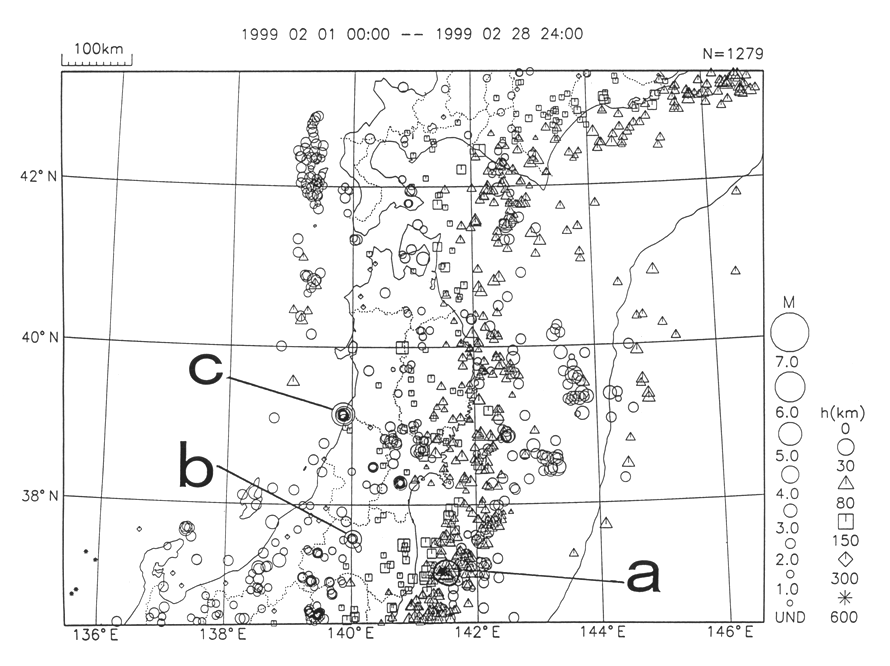 c) An M5.1 earthquake occurred on 26 Feb. off the southern coast of Akita Pref. and caused damage (maximum intensity: 5 lower).