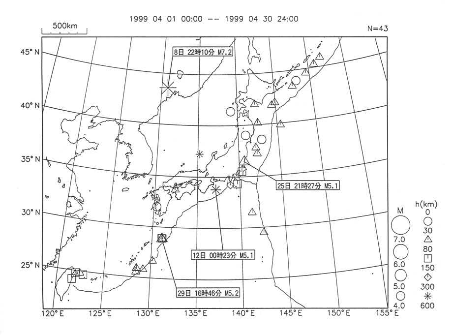 An M7.2 deep-focus earthquake occurred in the vicinity of Vladivostok. An M5.1 earthquake occurred in northern Ibaraki Pref. An M5.1 deep-focus earthquake occurred off the coast of the Tokai (Shizuoka-Aichi-Gifu) area. An M5.2 earthquake occurred in the sea northeast of Amami Oshima Island [Sea near Amami Oshima Island].