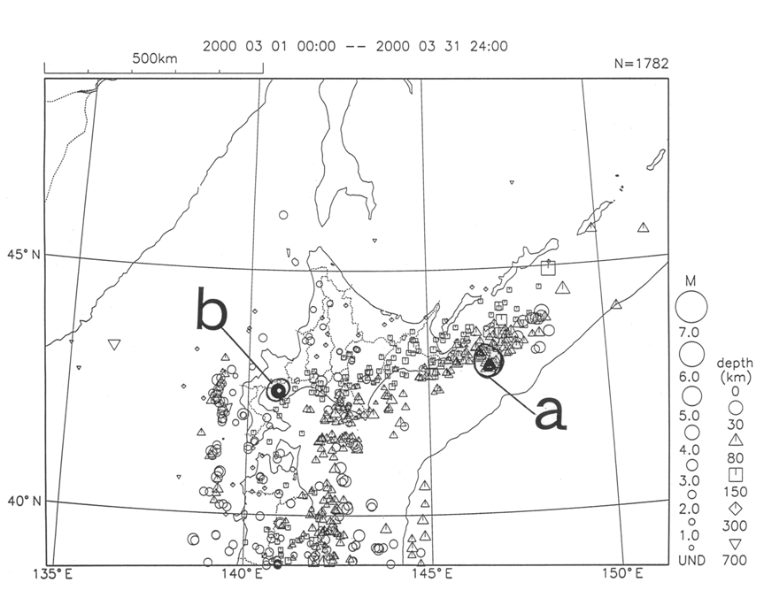 a) An M5.3 earthquake occurred on 30 March east offshore of Hokkaido [Southeast Offshore of Nemuro Peninsula]. This earthquake was situated northwest of the M6.8 event of 28 January and within the aftershock area of the 1994 East Offshore of Hokkaido Earthquake.