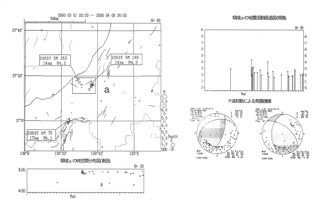 Also, an M4.0 shallow earthquake occurred on 25 March at a depth of 14 km within the crust, some 15km west of the 19 March event. The mechanism was the reverse fault type showing an ENE-WSW compression axis.