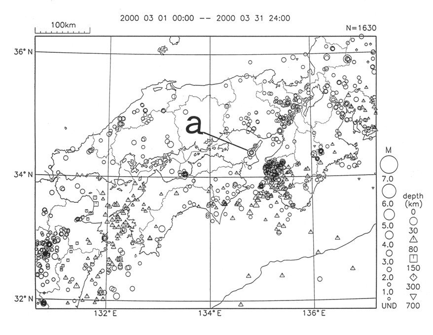 a) A shallow M4.1 earthquake occurred on 18 March in an area (Vicinity of Awaji Island) neighboring on the northeast fringe of the aftershock area of the 1995 Southern Hyogo Prefecture Earthquake.