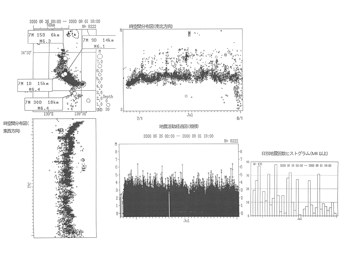 7月1日に神津島東方約5kmでM6.4の地震が発生し、神津島で震度6弱を観測した。また、7月9日に7月1日の地震の北東約2kmでM6.1の地震が発生し、神津島で震度6弱を観測した。7月15日には、新島の北西沖約2kmでM6.3の地震が発生し、新島で震度6弱を観測した。7月30日には、三宅島南西沖約10kmで、M6.4の地震が発生し、三宅島で震度6弱を観測した。