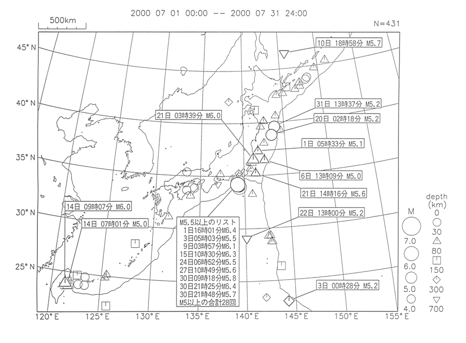 Seismic activity in the whole of Japan July 2000 (Magnitude 4 and greater)