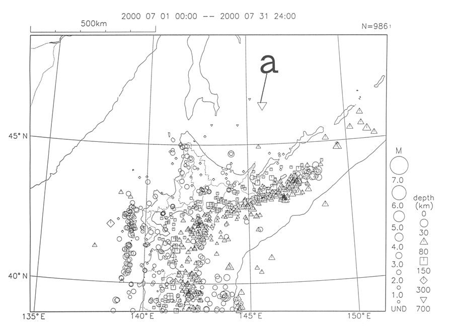 a) On July 10th, there was a deep M5.7 event (at a depth of 390 km) in the southern Sea of Okhotsk.