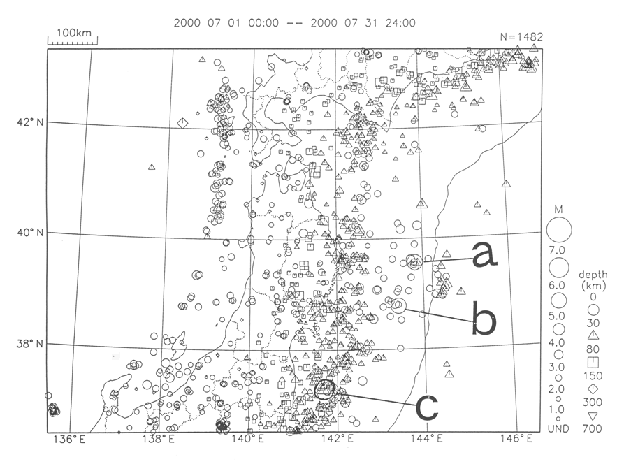 b) On July 20th, there was an M5.2 event occurring in conjunction with the subduction of the Pacific Plate in the sea off Sanriku (off the coast of Miyagi Prefecture).