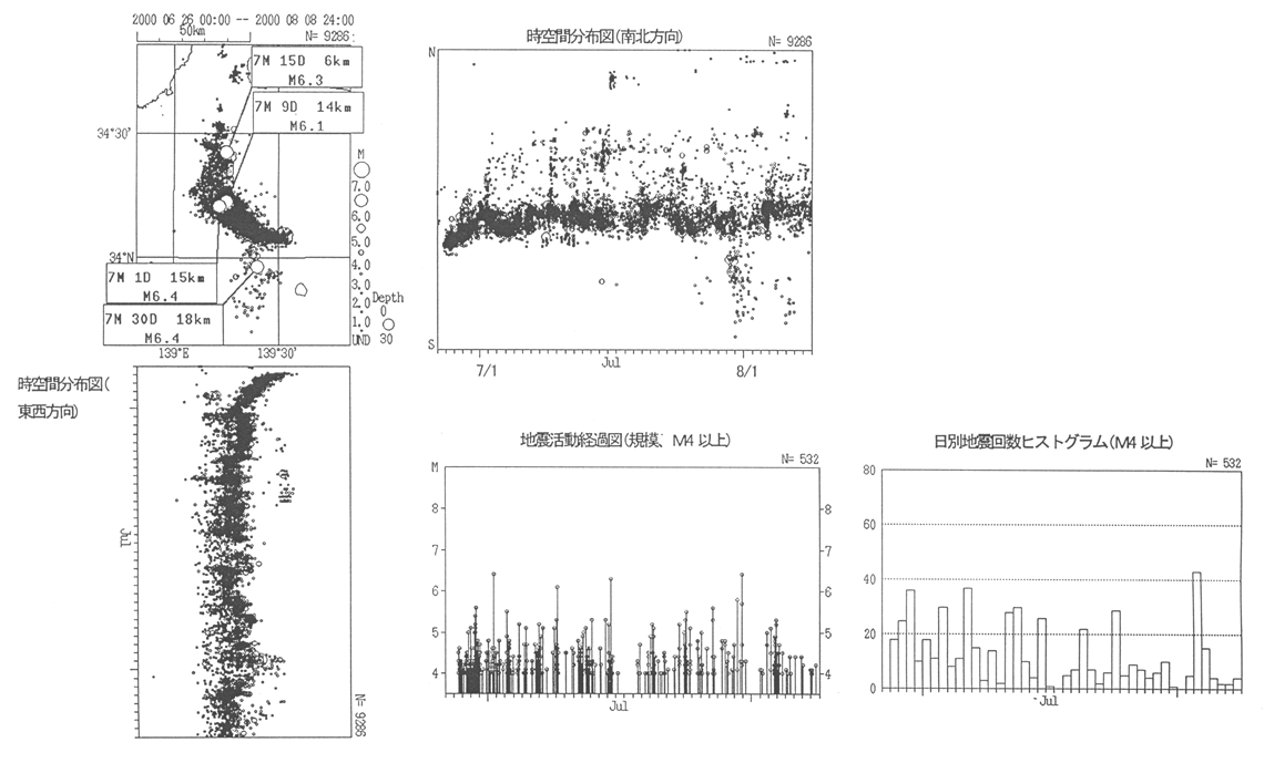 There has been continued seismic activity since the volcanic eruption on Miyakejima on June 26th in the area of Miyakejima, Niijima and Kozushima, with 532 events of M4 or greater recorded from the start of the activity to August 8th. On July 1st, there was an M6.4 event in the sea about 5 km east of Kozushima, which registered seismic intensity of 6 lower on Kozushima. Then, on July 9th, 2 km northeast of the July 1st event, there was an M6.1 event, which registered seismic intensity of 6 lower on Kozushima. On July 15th, there was an M6.3 event about 2 km northwest of Niijima, which registered seismic intensity of 6 lower on Niijima. On July 30th, there was an M6.4 event in the sea 10 km southwest of Miyakejima, which registered seismic intensity of 6 lower on Miyakejima.
