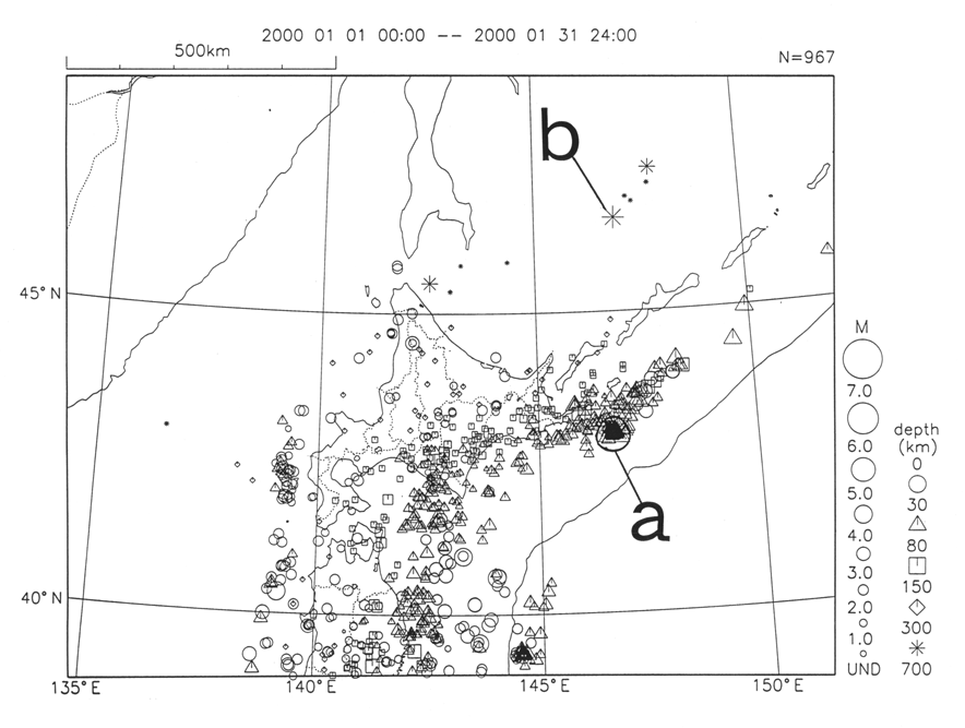 b) There was a deep-focus M5.0 earthquake on 6 January in the south of the Sea of Ohkotsk.