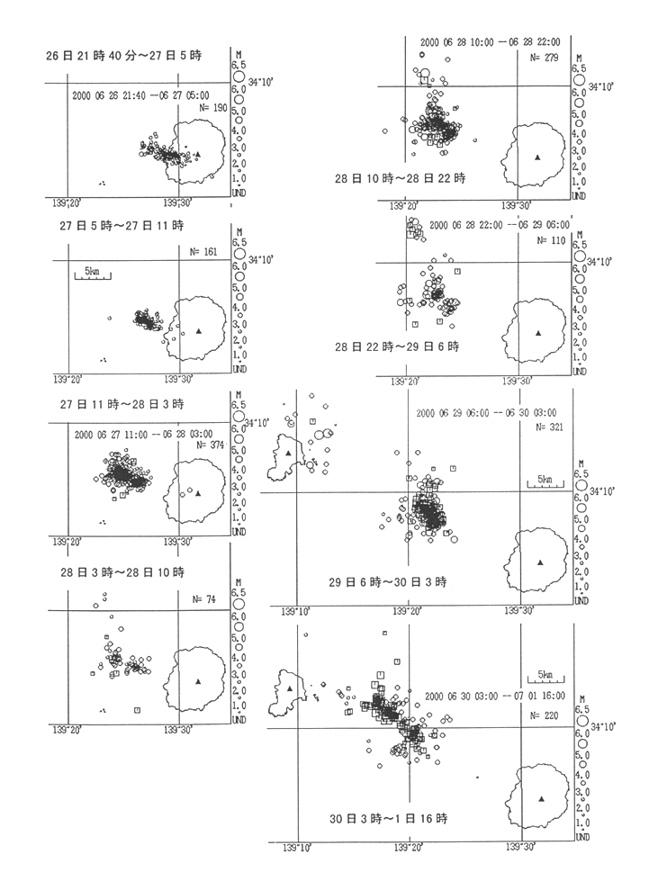 The scale of the earthquakes increased with the shift of the hypocenters to the west and northwest. It appears that the hypocenters are occurring within a number of blocks, and that their movements are generally not contiguous. Epicenters appear in the periods determined by the activity in each block.
