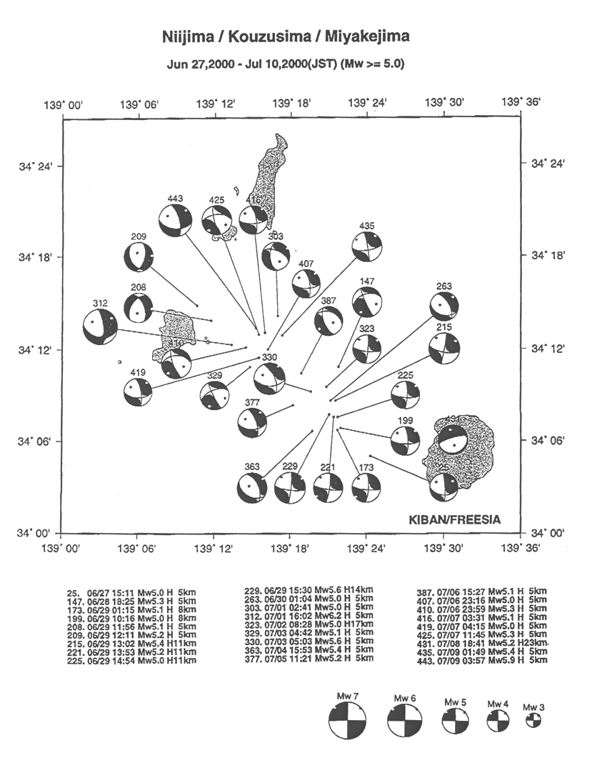 Focal mechanisms of seismic events in the area of Niijima-Kozushima and the sea west of Miyakejima (27 June to 10 July)