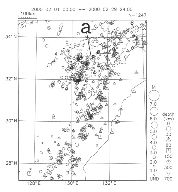 a) A shallow M4.1 earthquake occurred on 28 February in the Aso region of Kumamoto Pref. (maximum intensity: 4).