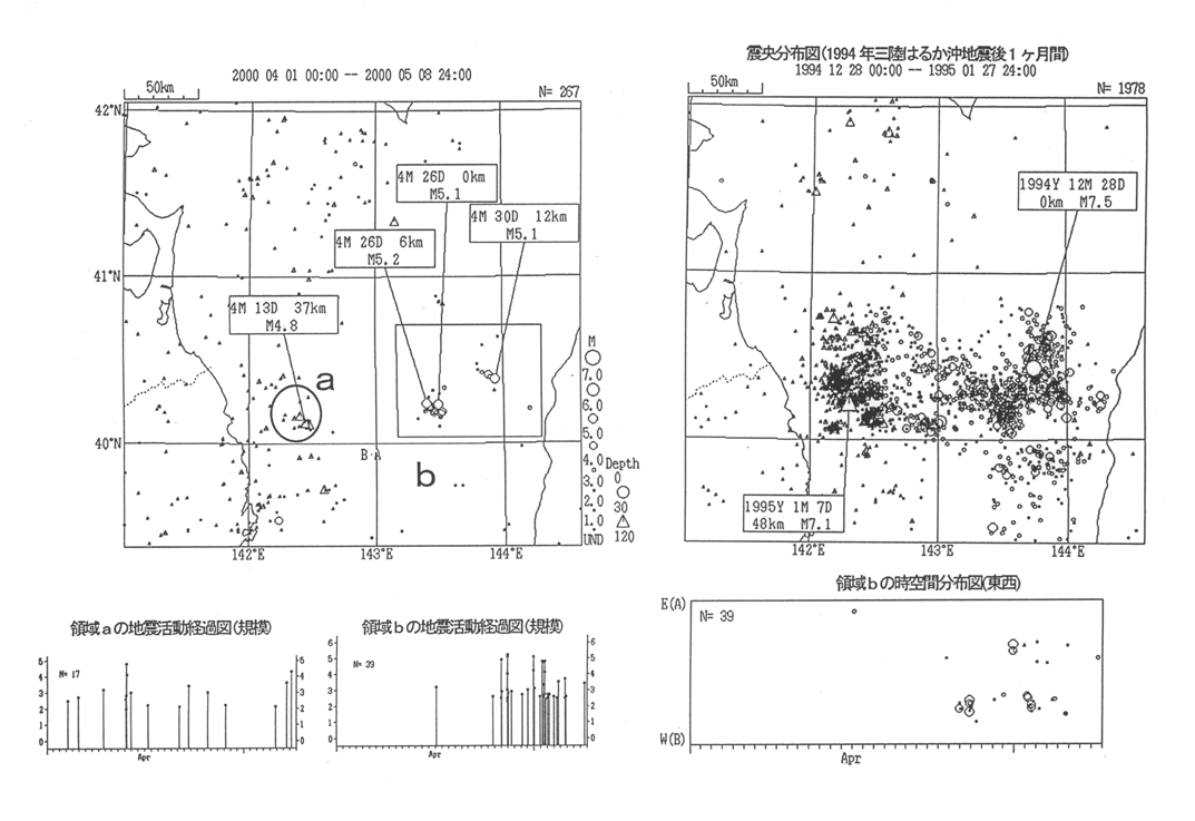 In Area a, there was an M4.8 event on April 13, and in Area b there were two events of M5.1 and M5.2 on April 26. Also, on April 30, there was an M5.1 in the eastern part of Area b. All of these events occurred within the aftershock region of the 1994 Sanriku Haruka Offshore earthquake.