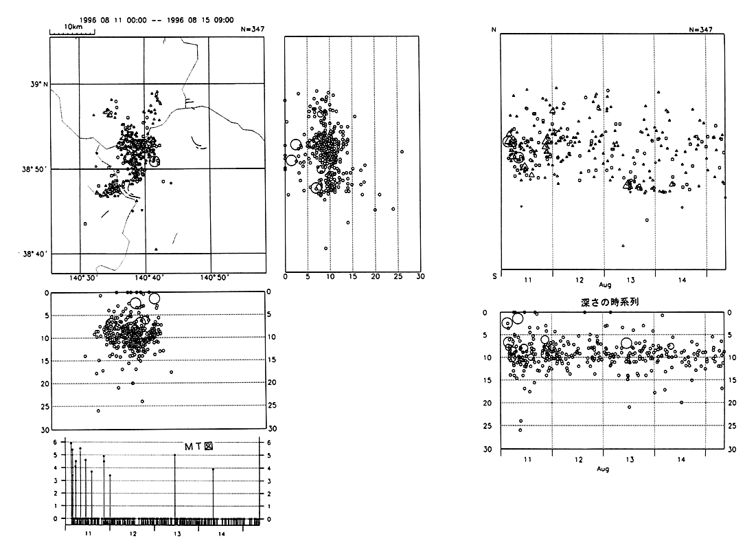 秋田・宮城県境付近の地震活動(1996/8/11−8/15 09:00)
