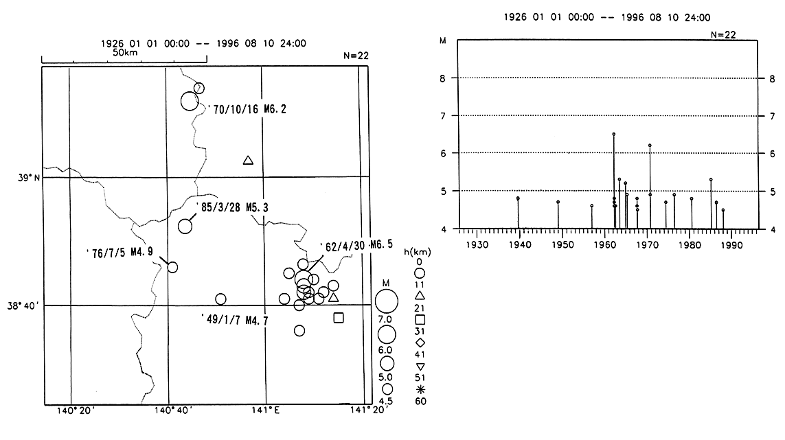 秋田・宮城県境付近の地震活動(1926−1996/8/10 M4.5以上)