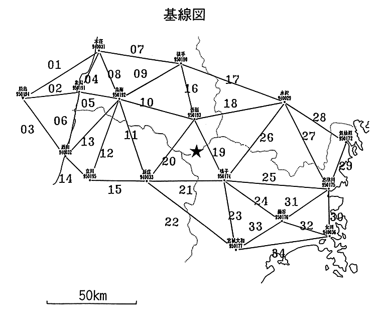 秋田・宮城県境付近のGPS連続観測(基線図)