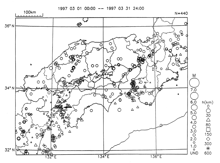 4月に入って愛媛県西部の深さ40km−50kmで、1日にM4.7、3日にM4.9の地震が発生した(図中矢印)。