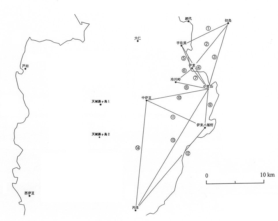 伊豆半島東方沖の群発地震活動に伴って、伊東市を中心にした地域の基線長に最大9cm程度の伸びが認められたが、その後、特に大きな変化は見られない。
