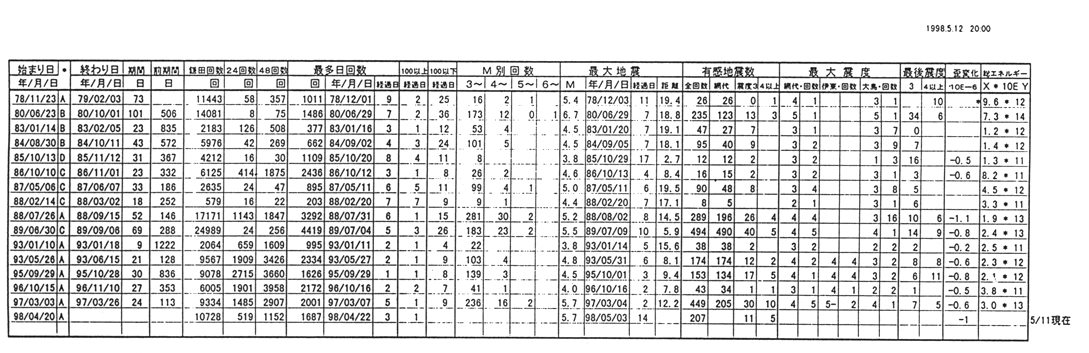 おもな群発地震活動(総エネルギーが10Ell以上および最大深度が3以上)