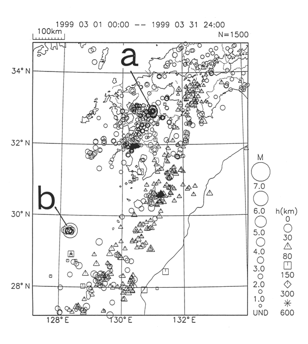 a) There was somewhat clustered seismic activity in the Aso district of Kumamoto Pref., the largest event of which was an M4.5 earthquake on 9 March (maximum intensity: 4).