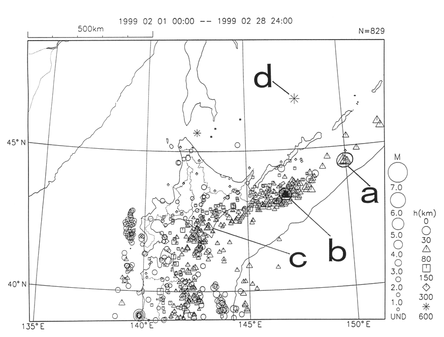 d) An M5.9 earthquake occurred on 5 Feb. in the southern reaches of the Sea of Okhotsk at a depth of about 430km.