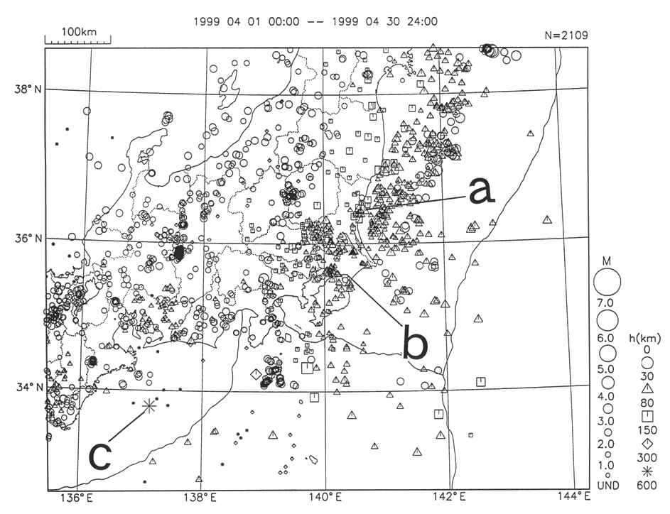 c) An M5.1 deep-focus earthquake occurred on 12 April off the coast of the Tokai area at a depth of 368km.