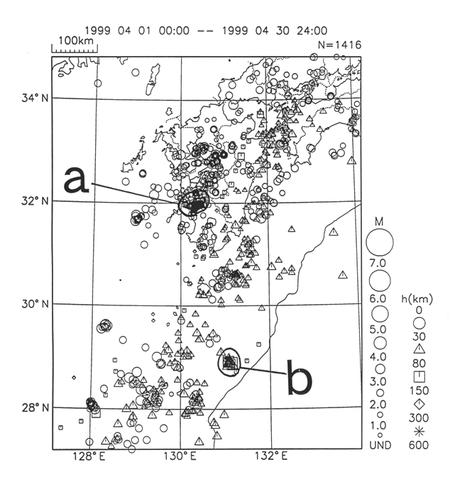 a) An M4.1 earthquake occurred on 3 April in the Satsuma region of Kagoshima Pref. (maximum intensity: 3).