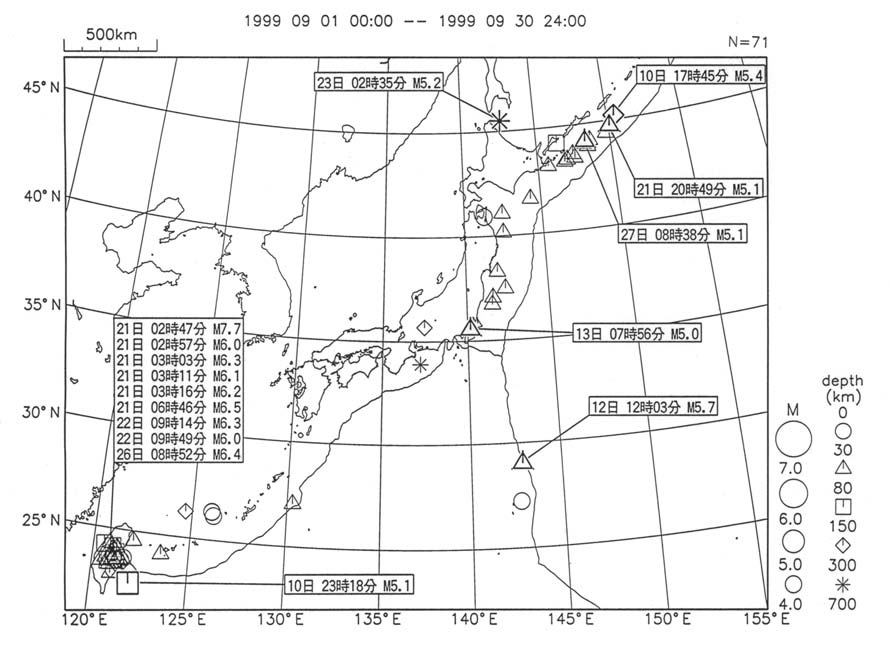 4 earthquakes in the territory herein considered, and 36 of them were events in the vicinity of Taiwan.
