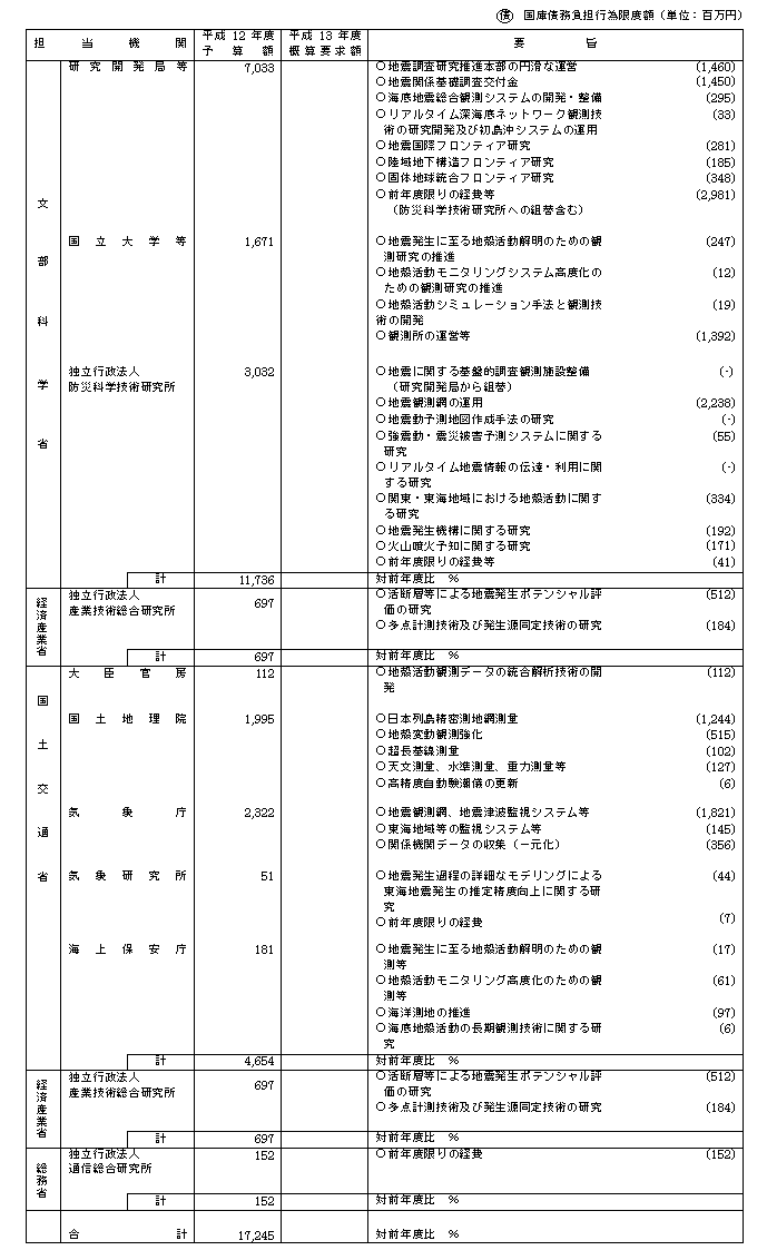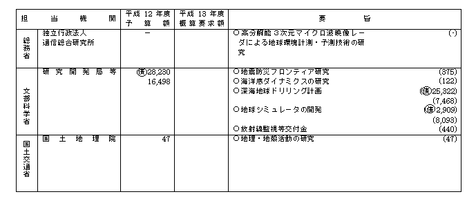 別表1 平成13年度地震調査研究関係政府予算概算要求(省庁別)