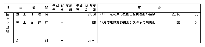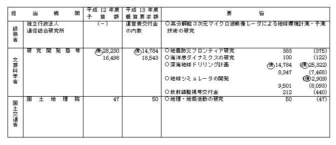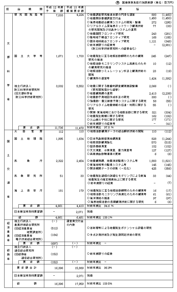 平成13年度地震調査研究関係政府予算概算要求(省庁別)