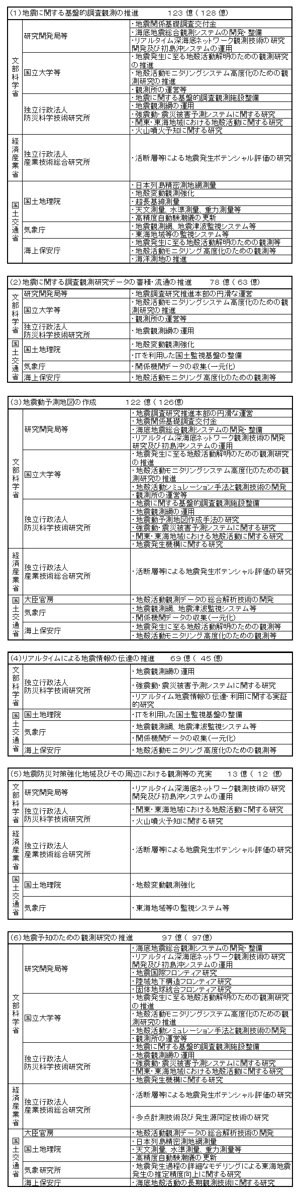 平成13年度地震調査研究関係政府予算概算要求(主要項目)