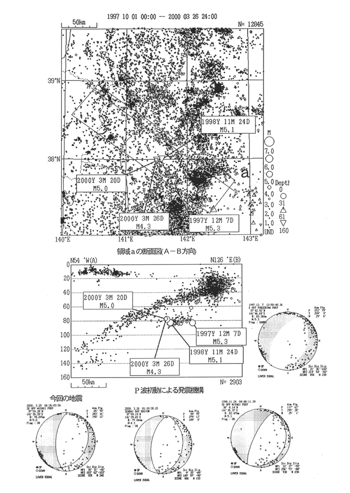 An M5.0 earthquake occurred on 20 March in Sendai Bay at a depth of 78km. This event occurred on the bottom plane of the subducting Pacific Plate's double-planed seismic zone, and the focal mechanism showed a torsion axis in the direction of the subducting plate.