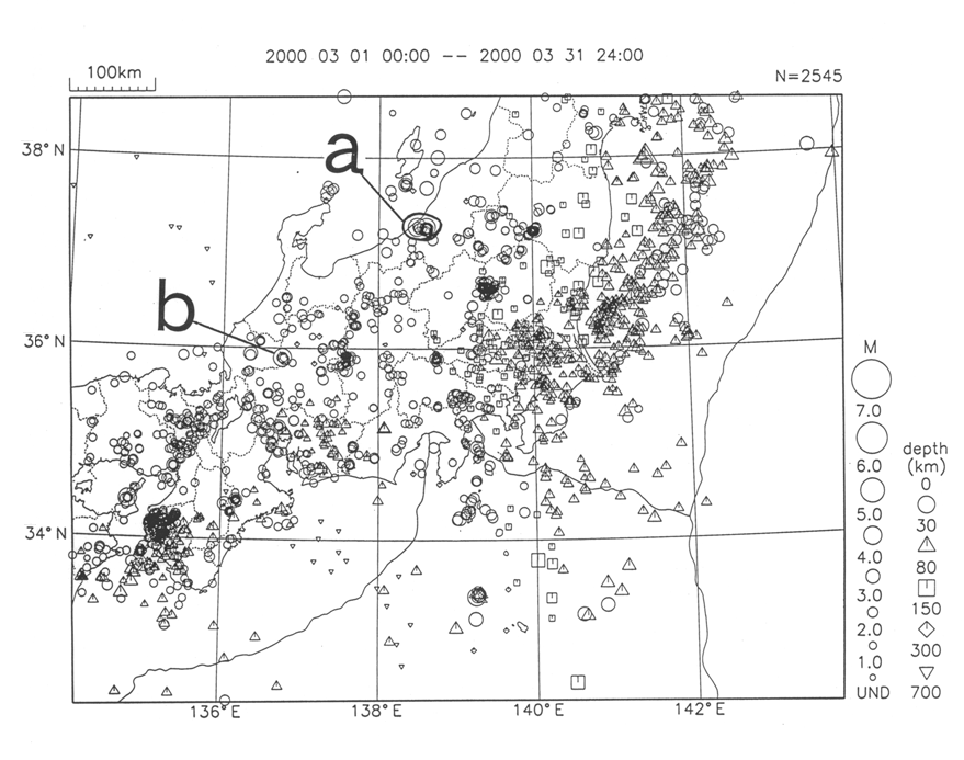 a) There was clustered seismic activity in the Chuetsu district of Niigata Pref., including an M4.3 earthquake (maximum intensity: 4) on 19 March and an M4.0 event (maximum intensity: 3) on 25 March.
