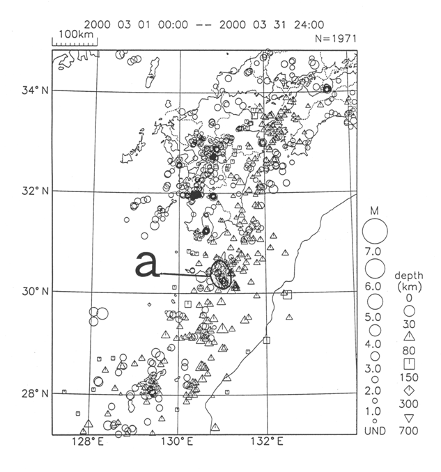 a)A shallow M4.0 earthquake occurred on 29 March in the sea near Tanegashima Island.