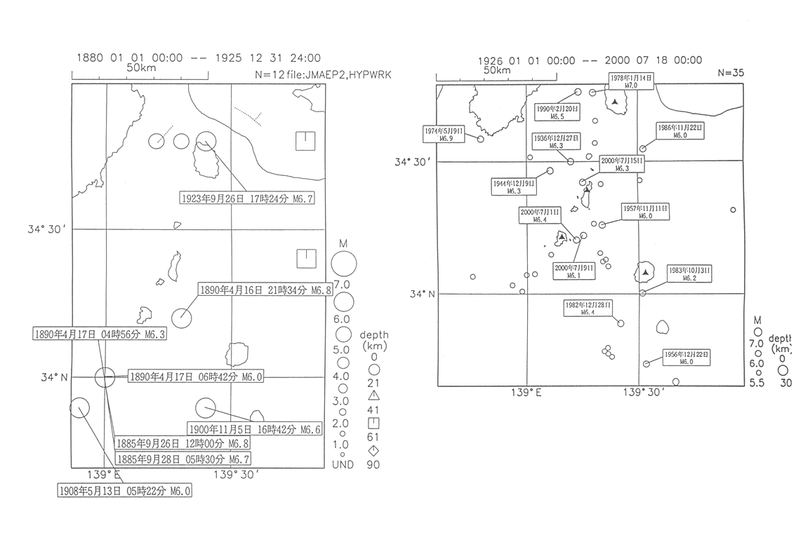 三宅島、新島、神津島周辺の過去(1880年以降)のM6以上の地震