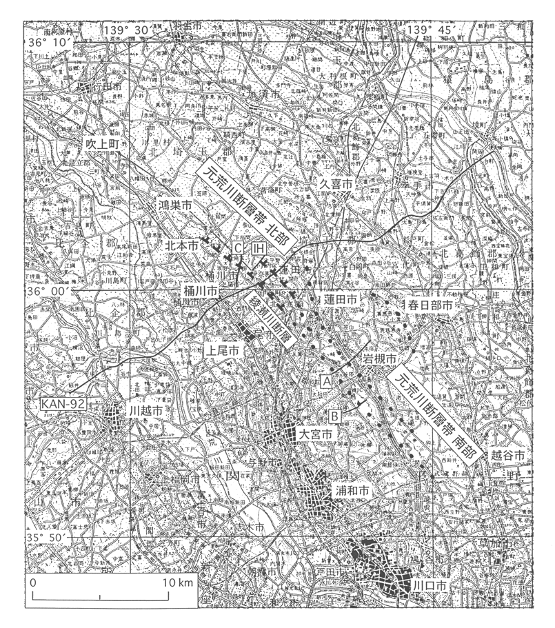 KAN−92は笠原(1995)の反射法弾性波探査測線。A,B,Cは埼玉県(1996)の反射法弾性波探査測線。IHは遠藤ほか(1997)の反射法弾性波探査測線。基図は国土地理院発行の1:200,000地勢図「東京」及び「宇都宮」を使用。