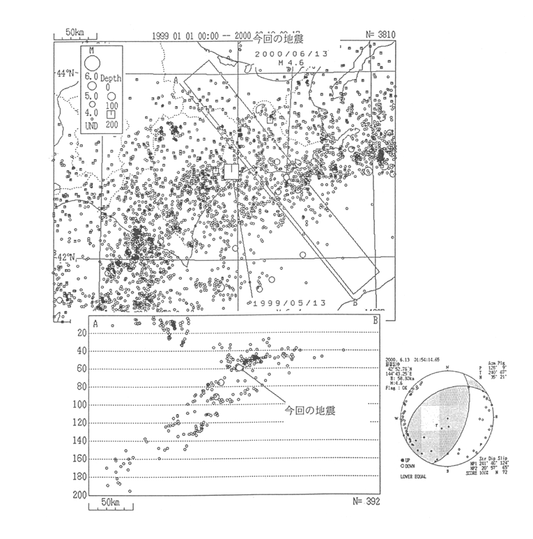 (fig.) Epicenter distribution map (above) and a cross section of a rectangular area (A-B direction) of the epicenter distribution map (below)
