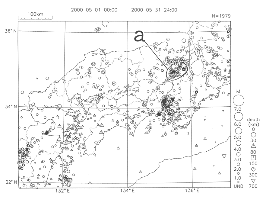 a)京都府南部周辺でM3クラスの地震が散発しており、京都・大阪府境[京都府南部]で5/16にM4.3の地震(最大震度3)が発生し、京都・滋賀府県境[京都府南部]で5/21にM3.8の地震(最大震度3)を最大地震とする地震活動があった。