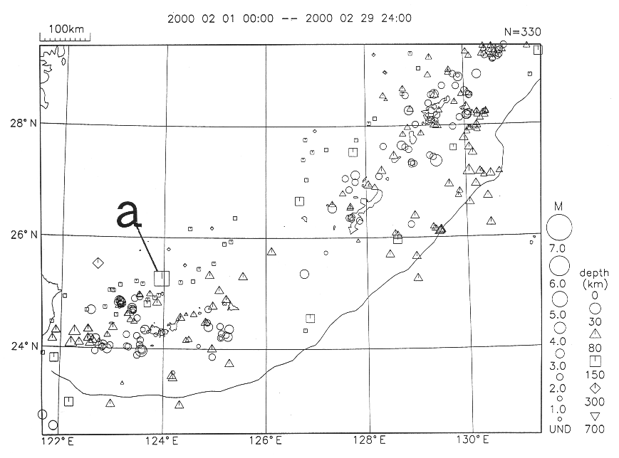 a) A fairly deep-focus M5.2 earthquake occurred on 25 February in the sea near Ishigakijima Island.
