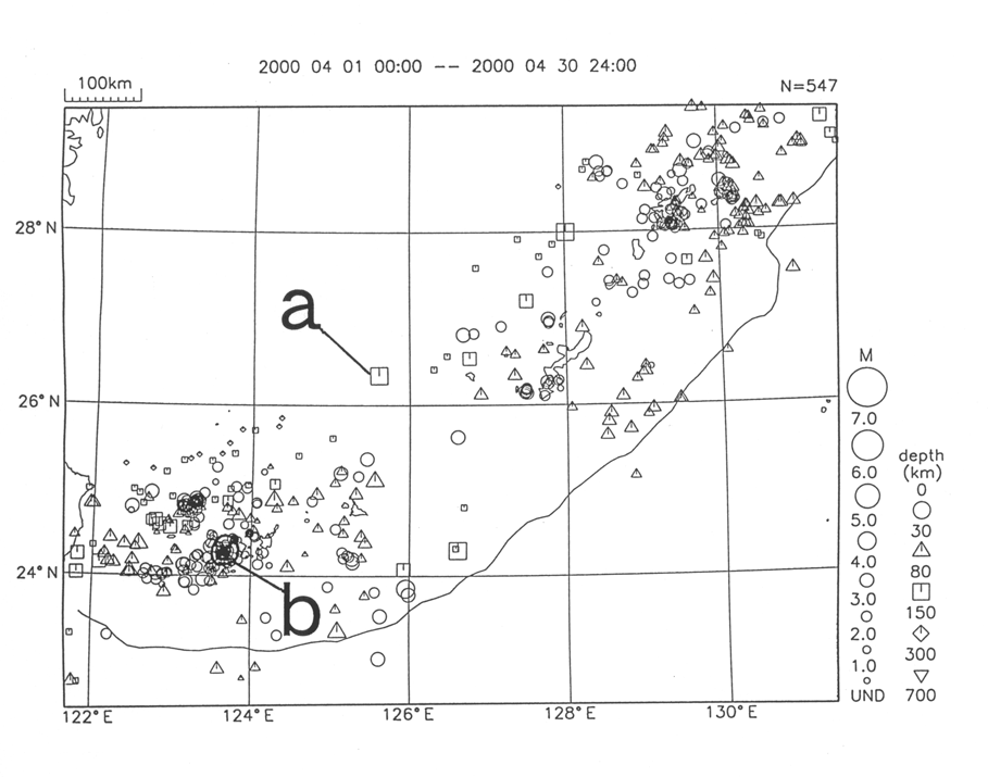 b)On April 10, there was seismic activity including an M4.2 event (maximum seismic intensity: 3) in the sea near Iriomotejima Island.