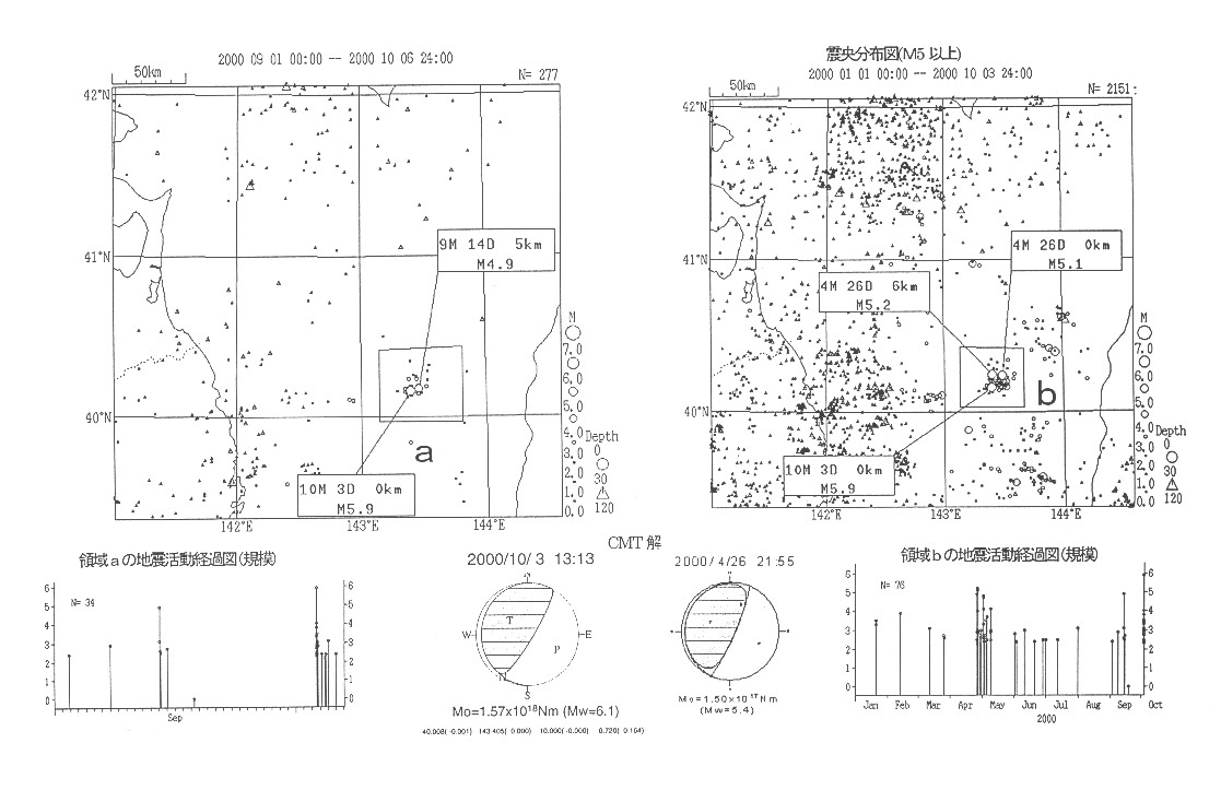 On the 14th, there was an M4.9 event in the sea off Sanriku, and October 3rd there was an M5.9 event in approximately the same location, with the focal mechanism being a reverse fault type with a northwest-southeast pressure axis. This area is within the aftershock zone of the Sanriku Haruka-Oki Earthquake in 1994, which saw concentrated M5 class seismic activity from late April to early May of this year.