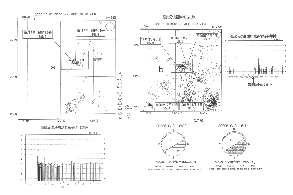 10月2日からM5.7を最大とするまとまった地震活動があり、M5.7とM5.2の地震の発震機構はともに北西−南東方向に張力軸を持つ正断層型だった。今回の活動域周辺では1991年8月3日にM5.9の地震と1995年12月17日にM5.4、12月18日にM5.3の地震が発生している。