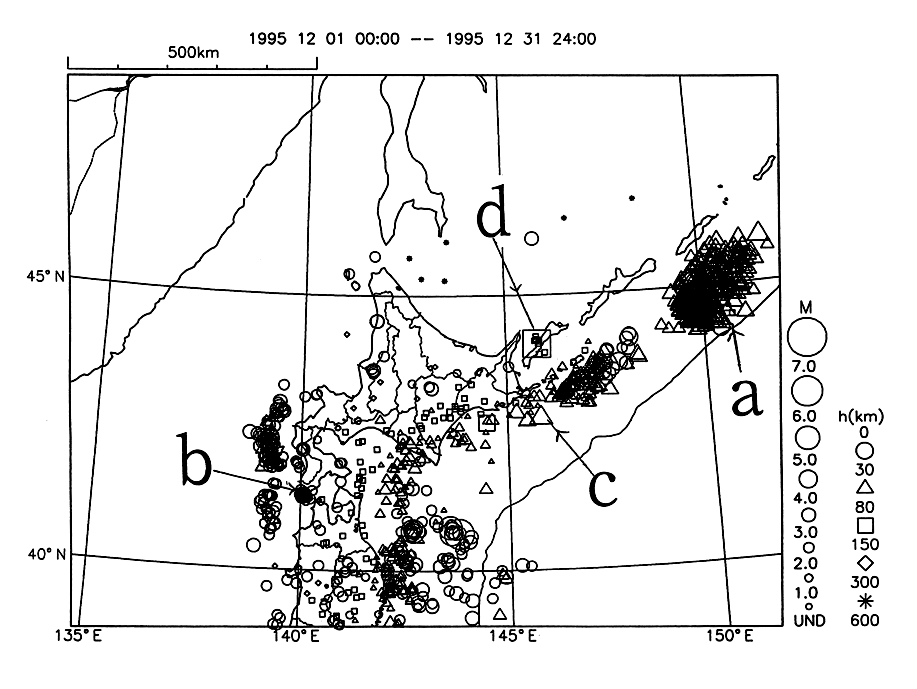 d)国後島で深さ約150kmのところにM6.0の地震が12月1日に発生した。