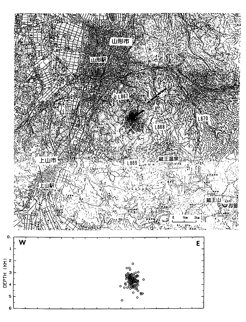 臨時観測による95年12月22日山形市南東部で発生した地震の余震の震源分布と東西断面図。