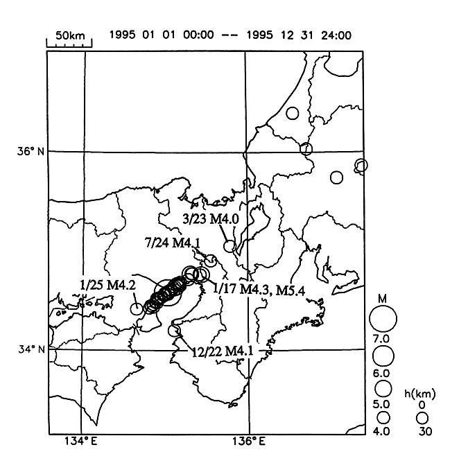この中には最大余震M5.4(1/17)もはいる。3/23の京都府中部の地震M4.0は花折断層のところで発生した。