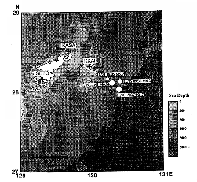 臨時観測は10月25日前後に開始した。海底地震計は合計22台設置されたが、本報告では図に示された2台のデータのみを解析に使用した。白丸は気象庁で決められたM5.7以上の地震の震央である。