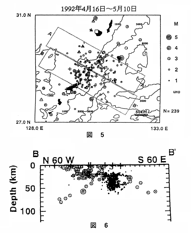 +印は海底地震観測点、四角印は陸上地震観測点。なお、この海底地震観測は北海道大学・東北大学・東京大学・鹿児島大学が1992年4月16日〜5月10日に合同で実施したものである。