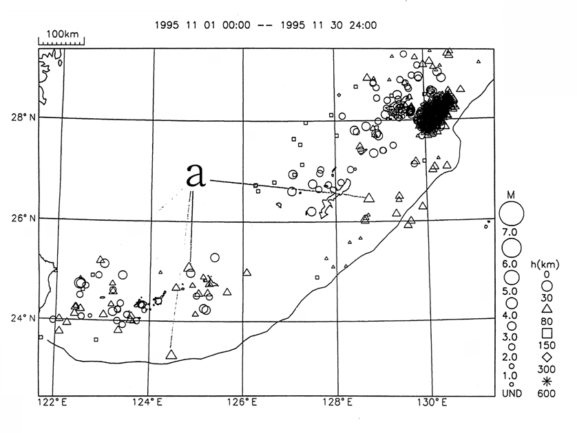 沖縄から台湾にかけて発生したM≧4の地震は4個で、最大は宮古島近海に発生した11/11のM4.8であった。