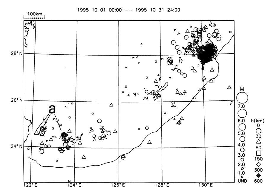 a)沖縄地方ではM≧4.0の地震は4個発生した。最大のものは14日12時01分に台湾付近で発生したM4.9であった。