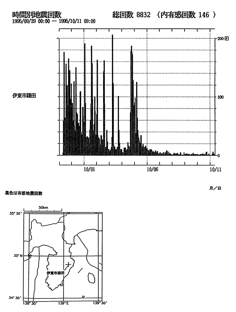 伊東市鎌田における時間別地震回数は、間欠的に増加したが、10月4日午後にピークを迎えたあとは減少し、7日以降は時間当たり6回以下となった。