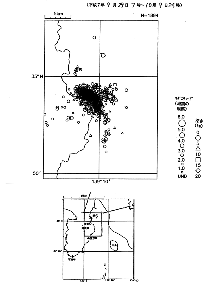 伊豆半島東方沖の地震(震央分布図 平成7年9月29日7時から10月9日24時)