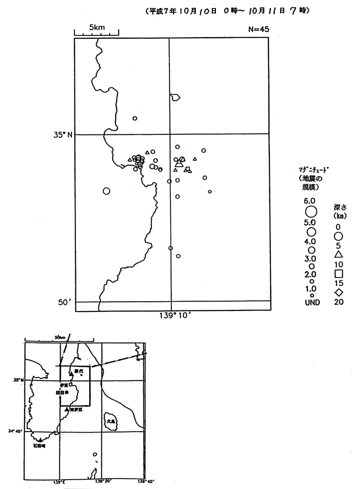 伊豆半島東方沖の地震(震央分布図 平成7年10月10日0時から10月11日7時)